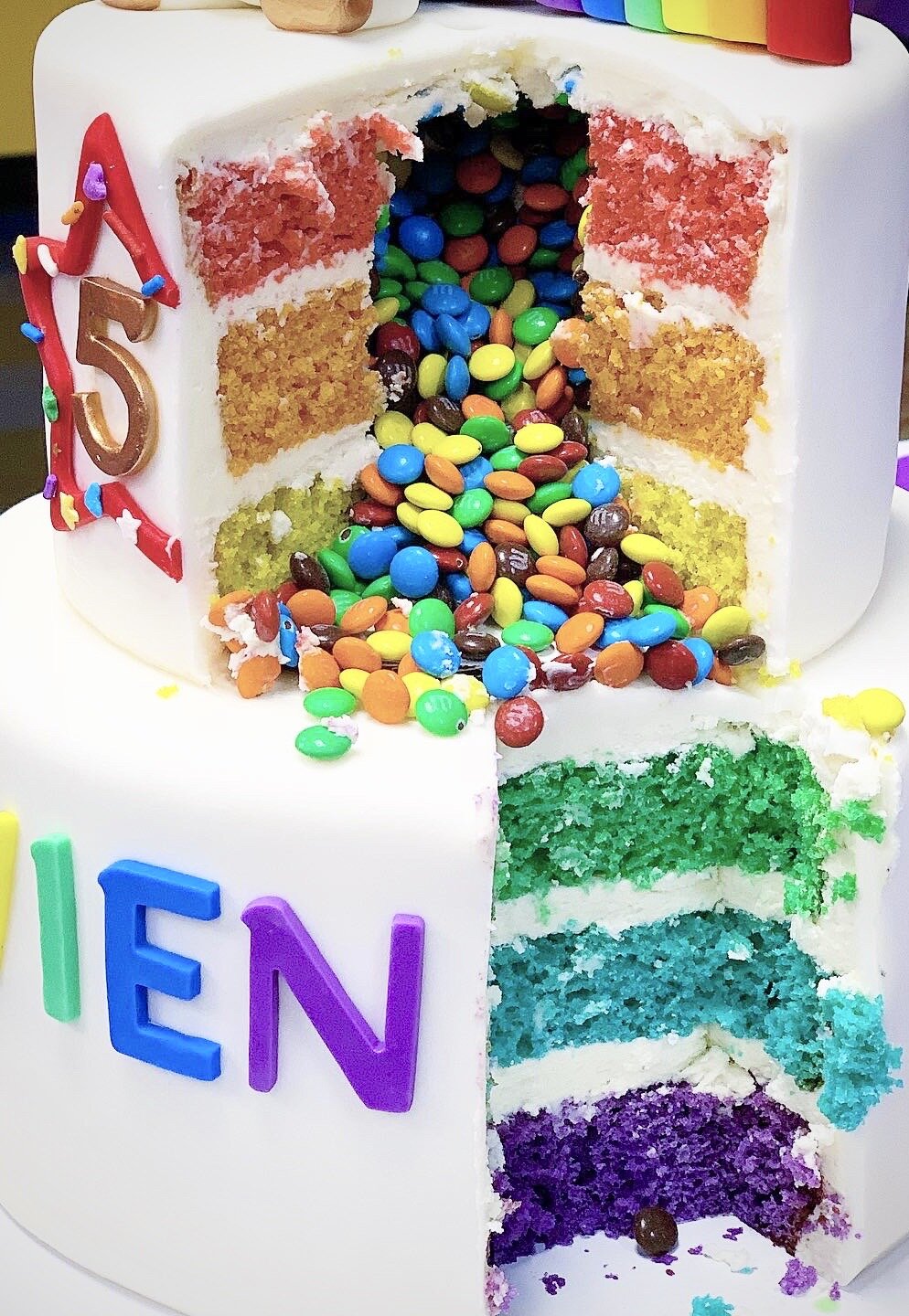 While the focus of most cake design is on the outside of the cake, the inside of the cake can be just as fun and surprising. Crystal offers rainbow swirl or other colored cake layers, as well as a sprinkle or candy explosion featuring custom mixes. The sprinkle or candy explosion is best suited to ages 4 and up (adults love it too!) Please refer to the Flavors page for additional information on these options.